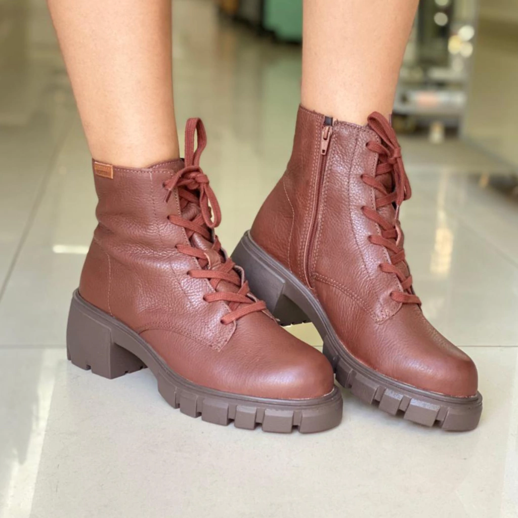 A bota possui um salto tratorado médio, o que oferece estabilidade e conforto ao caminhar. O salto tratorado é caracterizado por sua sola robusta e com relevos, que além de adicionar estilo, proporciona aderência e tração em diferentes tipos de terrenos.