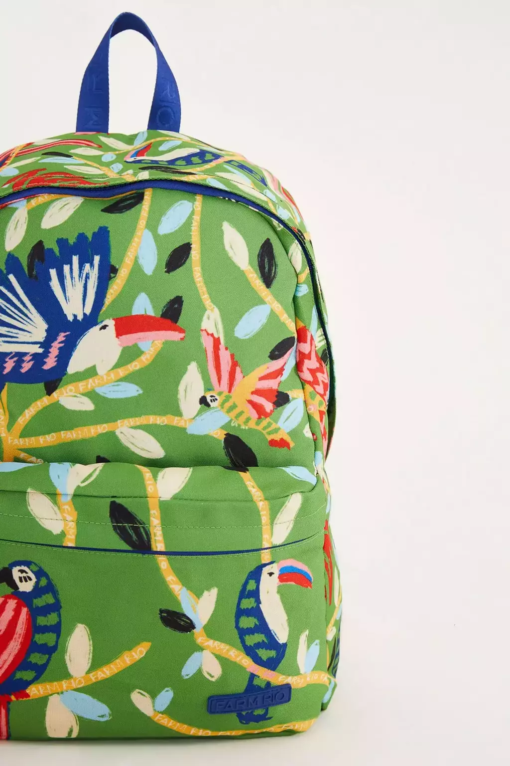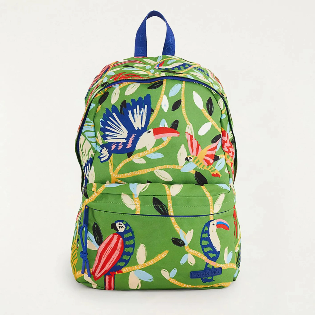 Mochila xodó bosque dos pássaros verde . com formato retangular, compartimento interno amplo com divisória e forro, bolso frontal com fechamento em zíper, parte posterior em mesh acolchoado, alça fixa de mão em gorgurão com o nome da marca em baixo relevo, alças longas e reguláveis e fechamento superior por zíper. o que não se veste, se vive. chegou farm etc, a marca de lifestyle da farm rio.