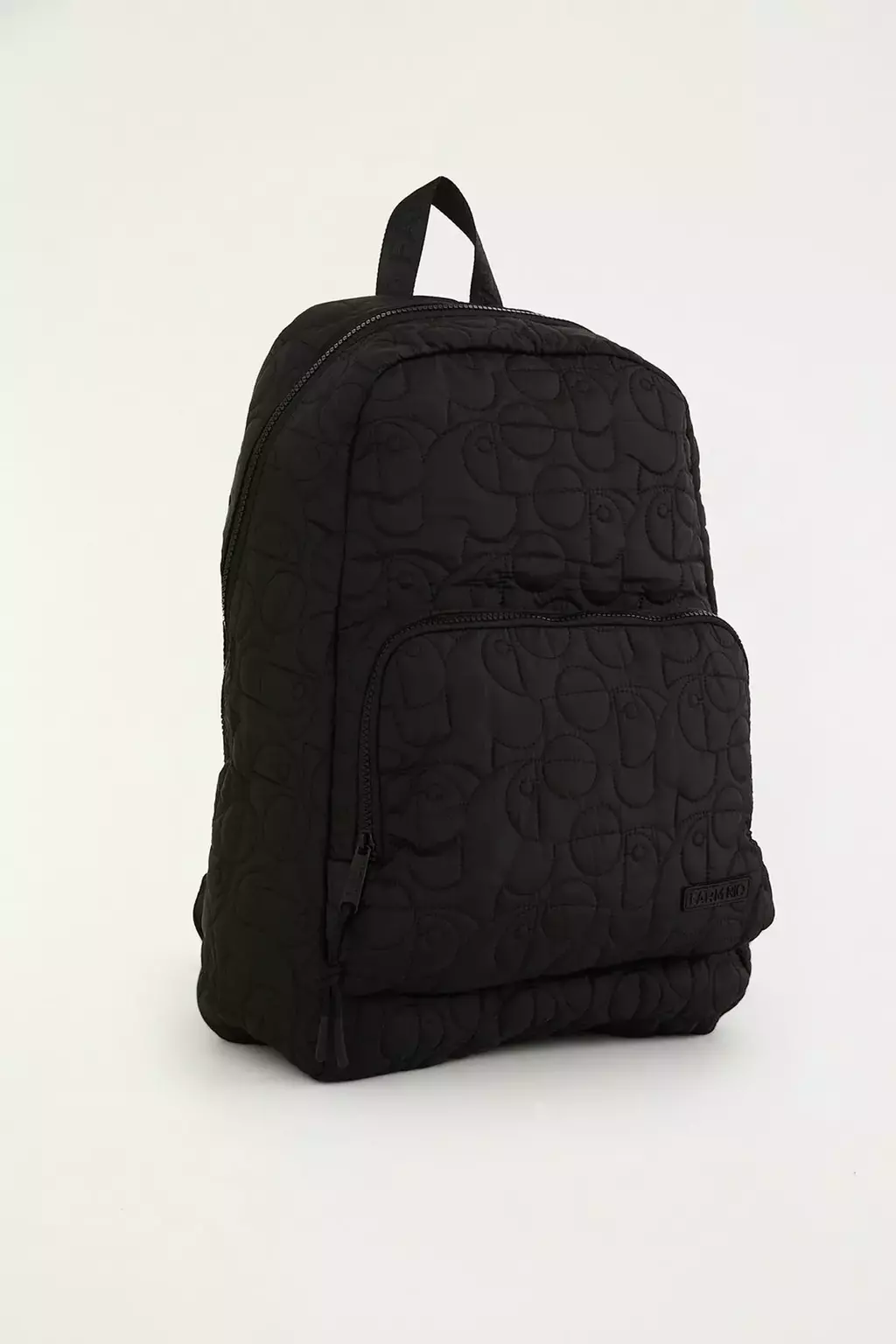 Mochila xodó puffer preto. possui formato retangular, compartimento interno amplo com divisória e forro, bolso frontal com fechamento em zíper, parte posterior em mesh acolchoado, alça fixa de mão em gorgurão com o nome da marca em baixo relevo, alças longas e reguláveis e fechamento superior por zíper. o que não se veste, se vive. chegou farm etc, a marca de lifestyle da farm rio.