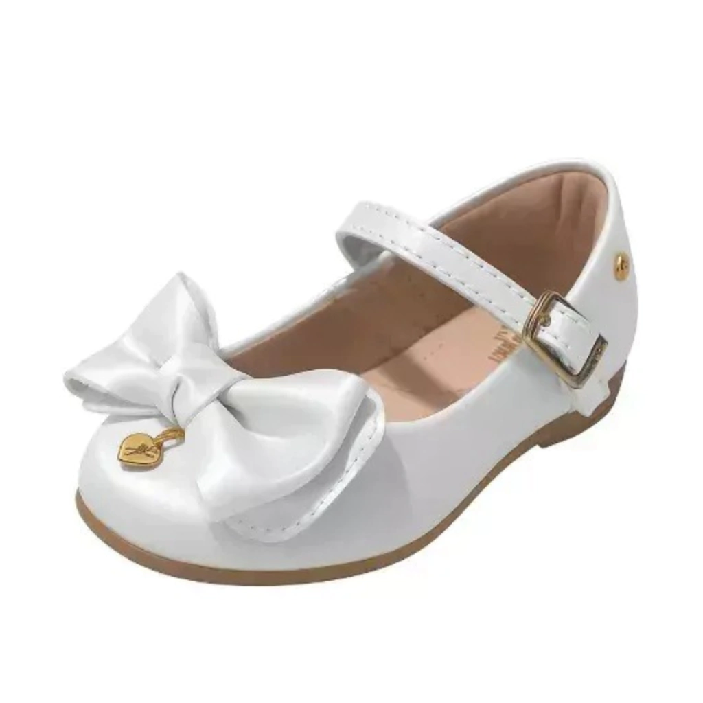 Delicado e encantador, este sapato infantil nude perolado é aquele item especial que transforma qualquer visual! Com bico arredondado, laço estruturado no cabedal e um mini pingente de coração pendurado no laço, trás detalhes adoráveis e cheio de ternura.